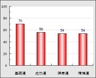 環境運 家庭や職場等での援助運・環境運を司ります。これが良いと配偶者や子供・職場の同僚などから助力が得られやすく、悪いと波乱・不和・孤独などがあります。 54点