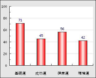 環境運 家庭や職場等での援助運・環境運を司ります。これが良いと配偶者や子供・職場の同僚などから助力が得られやすく、悪いと波乱・不和・孤独などがあります。 42点