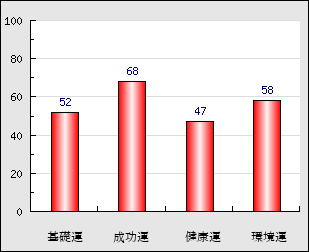 成功運 目的に対する成功運の強さをあらわします。この点数が高いほど自分の思い通りに成功し、逆に悪いと逆境・批判・障害などに苦心します。 68点