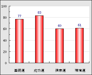 成功運 目的に対する成功運の強さをあらわします。この点数が高いほど自分の思い通りに成功し、逆に悪いと逆境・批判・障害などに苦心します。 83点