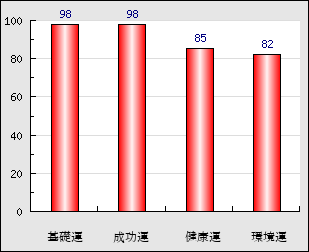 成功運 目的に対する成功運の強さをあらわします。この点数が高いほど自分の思い通りに成功し、逆に悪いと逆境・批判・障害などに苦心します。 98点