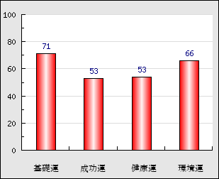 成功運 目的に対する成功運の強さをあらわします。この点数が高いほど自分の思い通りに成功し、逆に悪いと逆境・批判・障害などに苦心します。 53点