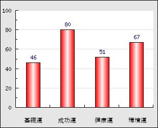 環境運 家庭や職場等での援助運・環境運を司ります。これが良いと配偶者や子供・職場の同僚などから助力が得られやすく、悪いと波乱・不和・孤独などがあります。 67点