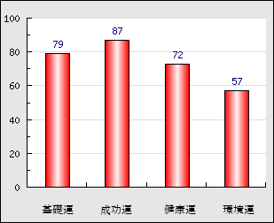 環境運 家庭や職場等での援助運・環境運を司ります。これが良いと配偶者や子供・職場の同僚などから助力が得られやすく、悪いと波乱・不和・孤独などがあります。 57点