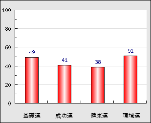 環境運 家庭や職場等での援助運・環境運を司ります。これが良いと配偶者や子供・職場の同僚などから助力が得られやすく、悪いと波乱・不和・孤独などがあります。 51点