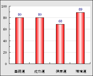 成功運 目的に対する成功運の強さをあらわします。この点数が高いほど自分の思い通りに成功し、逆に悪いと逆境・批判・障害などに苦心します。 80点