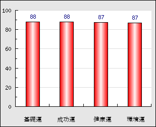 成功運 目的に対する成功運の強さをあらわします。この点数が高いほど自分の思い通りに成功し、逆に悪いと逆境・批判・障害などに苦心します。 88点