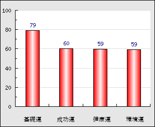 環境運 家庭や職場等での援助運・環境運を司ります。これが良いと配偶者や子供・職場の同僚などから助力が得られやすく、悪いと波乱・不和・孤独などがあります。 59点