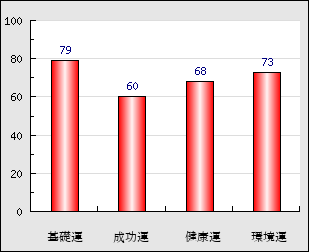 環境運 家庭や職場等での援助運・環境運を司ります。これが良いと配偶者や子供・職場の同僚などから助力が得られやすく、悪いと波乱・不和・孤独などがあります。 73点
