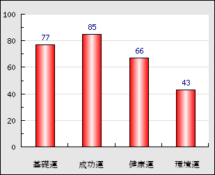 成功運 目的に対する成功運の強さをあらわします。この点数が高いほど自分の思い通りに成功し、逆に悪いと逆境・批判・障害などに苦心します。 85点