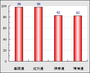 成功運 目的に対する成功運の強さをあらわします。この点数が高いほど自分の思い通りに成功し、逆に悪いと逆境・批判・障害などに苦心します。 98点