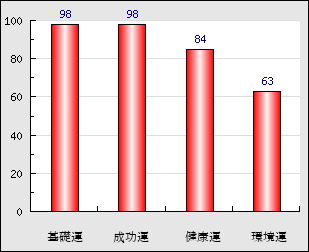 | 環境運 | 家庭や職場等での援助運・環境運を司ります。これが良いと配偶者や子供・職場の同僚などから助力が得られやすく、悪いと波乱・不和・孤独などがあります。 | 63点 |