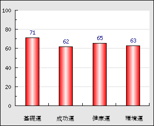 成功運 目的に対する成功運の強さをあらわします。この点数が高いほど自分の思い通りに成功し、逆に悪いと逆境・批判・障害などに苦心します。 62点