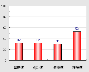環境運 家庭や職場等での援助運・環境運を司ります。これが良いと配偶者や子供・職場の同僚などから助力が得られやすく、悪いと波乱・不和・孤独などがあります。 53点