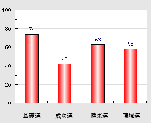 成功運 目的に対する成功運の強さをあらわします。この点数が高いほど自分の思い通りに成功し、逆に悪いと逆境・批判・障害などに苦心します。 42点