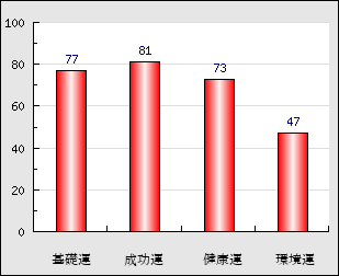 環境運 家庭や職場等での援助運・環境運を司ります。これが良いと配偶者や子供・職場の同僚などから助力が得られやすく、悪いと波乱・不和・孤独などがあります。 47点