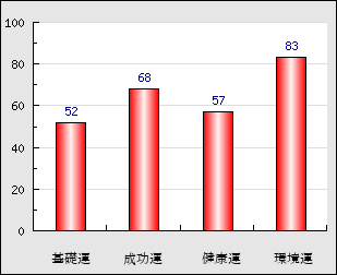 環境運 家庭や職場等での援助運・環境運を司ります。これが良いと配偶者や子供・職場の同僚などから助力が得られやすく、悪いと波乱・不和・孤独などがあります。 83点