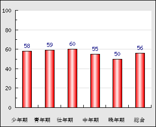 ※年代別運勢グラフは、あくまでも時期別の運勢を概算したものですので参考程度にご覧ください。少年期や青年期の運勢が平均と比べて高い場合は比較的若い頃に成功や幸福があり、反対に中年期や晩年期の運勢が平均と比べて高い場合は後年に華開く大器晩成型と言えるでしょう。ただし、少年期の運勢が低いからと言って、若い頃は成功しないといったことではありません。