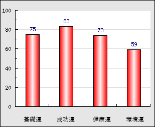 成功運 目的に対する成功運の強さをあらわします。この点数が高いほど自分の思い通りに成功し、逆に悪いと逆境・批判・障害などに苦心します。 83点
