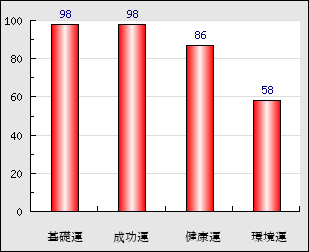 | 環境運 | 家庭や職場等での援助運・環境運を司ります。これが良いと配偶者や子供・職場の同僚などから助力が得られやすく、悪いと波乱・不和・孤独などがあります。 | 58点 |