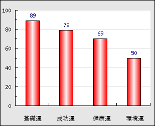 成功運 目的に対する成功運の強さをあらわします。この点数が高いほど自分の思い通りに成功し、逆に悪いと逆境・批判・障害などに苦心します。 79点