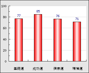 成功運 目的に対する成功運の強さをあらわします。この点数が高いほど自分の思い通りに成功し、逆に悪いと逆境・批判・障害などに苦心します。 85点