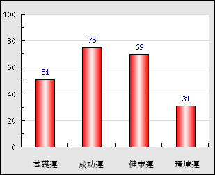 成功運 目的に対する成功運の強さをあらわします。この点数が高いほど自分の思い通りに成功し、逆に悪いと逆境・批判・障害などに苦心します。 75点