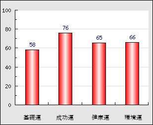 環境運 家庭や職場等での援助運・環境運を司ります。これが良いと配偶者や子供・職場の同僚などから助力が得られやすく、悪いと波乱・不和・孤独などがあります。 66点
