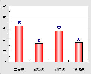 成功運 目的に対する成功運の強さをあらわします。この点数が高いほど自分の思い通りに成功し、逆に悪いと逆境・批判・障害などに苦心します。 33点