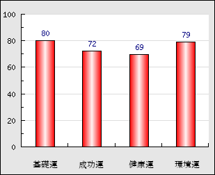 | 環境運 | 家庭や職場等での援助運・環境運を司ります。これが良いと配偶者や子供・職場の同僚などから助力が得られやすく、悪いと波乱・不和・孤独などがあります。 | 79点 |