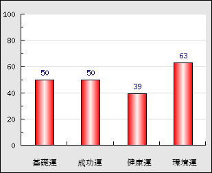 環境運 家庭や職場等での援助運・環境運を司ります。これが良いと配偶者や子供・職場の同僚などから助力が得られやすく、悪いと波乱・不和・孤独などがあります。 63点