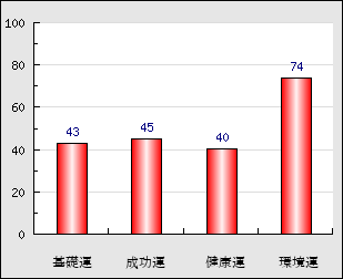 環境運 家庭や職場等での援助運・環境運を司ります。これが良いと配偶者や子供・職場の同僚などから助力が得られやすく、悪いと波乱・不和・孤独などがあります。 74点