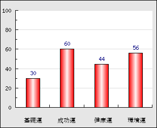 成功運 目的に対する成功運の強さをあらわします。この点数が高いほど自分の思い通りに成功し、逆に悪いと逆境・批判・障害などに苦心します。 60点