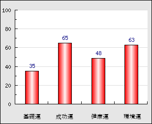 成功運 目的に対する成功運の強さをあらわします。この点数が高いほど自分の思い通りに成功し、逆に悪いと逆境・批判・障害などに苦心します。 65点