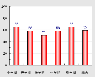 ※年代別運勢グラフは、あくまでも時期別の運勢を概算したものですので参考程度にご覧ください。少年期や青年期の運勢が平均と比べて高い場合は比較的若い頃に成功や幸福があり、反対に中年期や晩年期の運勢が平均と比べて高い場合は後年に華開く大器晩成型と言えるでしょう。ただし、少年期の運勢が低いからと言って、若い頃は成功しないといったことではありません。