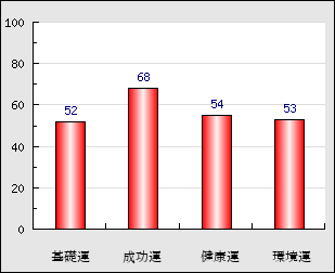 成功運 目的に対する成功運の強さをあらわします。この点数が高いほど自分の思い通りに成功し、逆に悪いと逆境・批判・障害などに苦心します。 68点