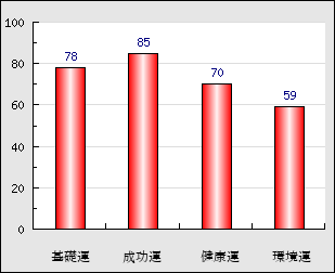 環境運 家庭や職場等での援助運・環境運を司ります。これが良いと配偶者や子供・職場の同僚などから助力が得られやすく、悪いと波乱・不和・孤独などがあります。 59点