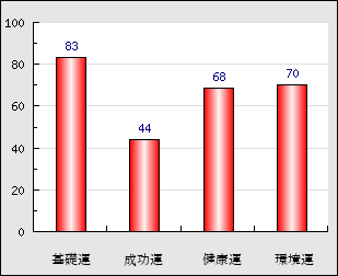 成功運 目的に対する成功運の強さをあらわします。この点数が高いほど自分の思い通りに成功し、逆に悪いと逆境・批判・障害などに苦心します。 44点