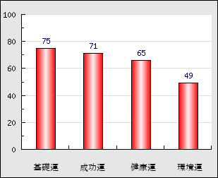 環境運 家庭や職場等での援助運・環境運を司ります。これが良いと配偶者や子供・職場の同僚などから助力が得られやすく、悪いと波乱・不和・孤独などがあります。 49点