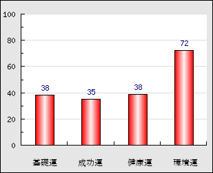 成功運 目的に対する成功運の強さをあらわします。この点数が高いほど自分の思い通りに成功し、逆に悪いと逆境・批判・障害などに苦心します。 35点
