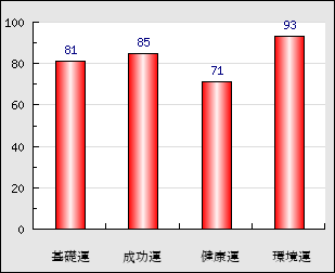 環境運 家庭や職場等での援助運・環境運を司ります。これが良いと配偶者や子供・職場の同僚などから助力が得られやすく、悪いと波乱・不和・孤独などがあります。 93点