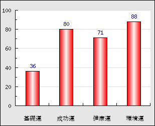 環境運 家庭や職場等での援助運・環境運を司ります。これが良いと配偶者や子供・職場の同僚などから助力が得られやすく、悪いと波乱・不和・孤独などがあります。 88点