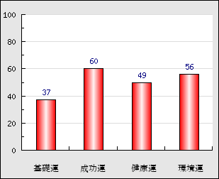 成功運 目的に対する成功運の強さをあらわします。この点数が高いほど自分の思い通りに成功し、逆に悪いと逆境・批判・障害などに苦心します。 60点