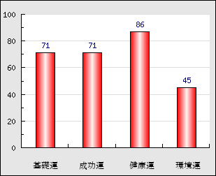 環境運 家庭や職場等での援助運・環境運を司ります。これが良いと配偶者や子供・職場の同僚などから助力が得られやすく、悪いと波乱・不和・孤独などがあります。 45点