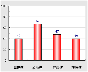 環境運 家庭や職場等での援助運・環境運を司ります。これが良いと配偶者や子供・職場の同僚などから助力が得られやすく、悪いと波乱・不和・孤独などがあります。 40点
