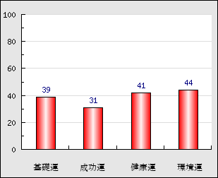 成功運 目的に対する成功運の強さをあらわします。この点数が高いほど自分の思い通りに成功し、逆に悪いと逆境・批判・障害などに苦心します。 31点