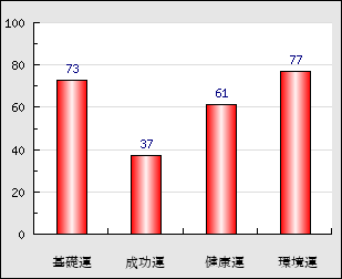 成功運 目的に対する成功運の強さをあらわします。この点数が高いほど自分の思い通りに成功し、逆に悪いと逆境・批判・障害などに苦心します。 37点