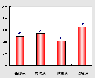 環境運 家庭や職場等での援助運・環境運を司ります。これが良いと配偶者や子供・職場の同僚などから助力が得られやすく、悪いと波乱・不和・孤独などがあります。 65点