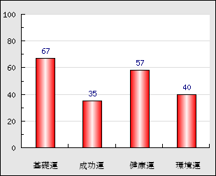 環境運 家庭や職場等での援助運・環境運を司ります。これが良いと配偶者や子供・職場の同僚などから助力が得られやすく、悪いと波乱・不和・孤独などがあります。 40点