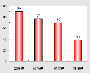 成功運 目的に対する成功運の強さをあらわします。この点数が高いほど自分の思い通りに成功し、逆に悪いと逆境・批判・障害などに苦心します。 77点